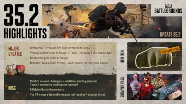 KRAFTON, Inc. veröffentlicht heute die PC-Version von Update 35.2 für PUBG: BATTLEGROUNDS, die Konsolenversion folgt am 22. Mai. Als Teil der Roadmap des Spiels für 2025 bringt dieses Update zerstörbare Umgebungen nach Taego, erweitert taktische Werkzeuge wie Fahrzeugtarnungen und vereinheitlicht Gameplay-Elemente auf den verschiedenen Karten. Dieses Update setzt PUBGs Bestreben fort, das Spielerlebnis zu modernisieren und seine Stellung im kompetitiven Battle-Royale-Genre zu behaupten. Die vollständigen Patchnotizen können hier gefunden werden.