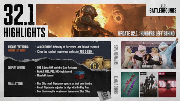 AMSTERDAM, NETHERLANDS – 10 OCTOBER, 2024 – KRAFTON, Inc. is excited to announce the release of PUBG: BATTLEGROUNDS Update 32.1, bringing significant improvements and new gameplay experiences for players. This patch includes a global region merge, a challenging new Arcade mode, and long-awaited adjustments to Care Package items, alongside other exciting updates. Key update highlights can be found below or you can check out the full patch notes here: Update 32.1 patch notes.